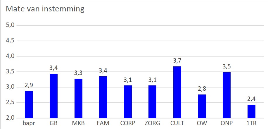 Figuur 1. Mate van instemming bij wenselijke situatie voor de bedrijfsprofielen1. Er is gebruik gemaakt van een 5-puntsschaal met: 1 = volstrekt oneens, 2 = oneens, 3 = deels oneens / deels eens, 4 = mee eens en 5 = volstrekt mee eens. Bapr= basisprofiel/beursgenoteerd bedrijf, GB= groot niet-beursgenoteerd profit bedrijf, FAM= familiebedrijf, Corp= de woningcorporatie, OW= onderwijs, ONP= overige non-profit en 1TR= one tier.