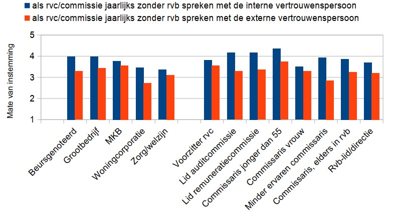 Bij de persoonsgebonden benchmarks zijn de commissaris die lid is van de auditcommissie of de remuneratiecommissie en de jongere commissaris (<55 jaar) een duidelijk voorstander van zo’n gesprek (duidelijk eens met de stelling) en is de vrouwelijke commissaris wat behoudender (slechts min of meer mee eens met stelling). Maar ondanks deze verschillen is iedereen het er op zijn minst min of meer mee eens dat een gesprek met een interne vertrouwenspersoon, zonder rvb, bij kan dragen aan een goede informatievoorziening van de rvc.